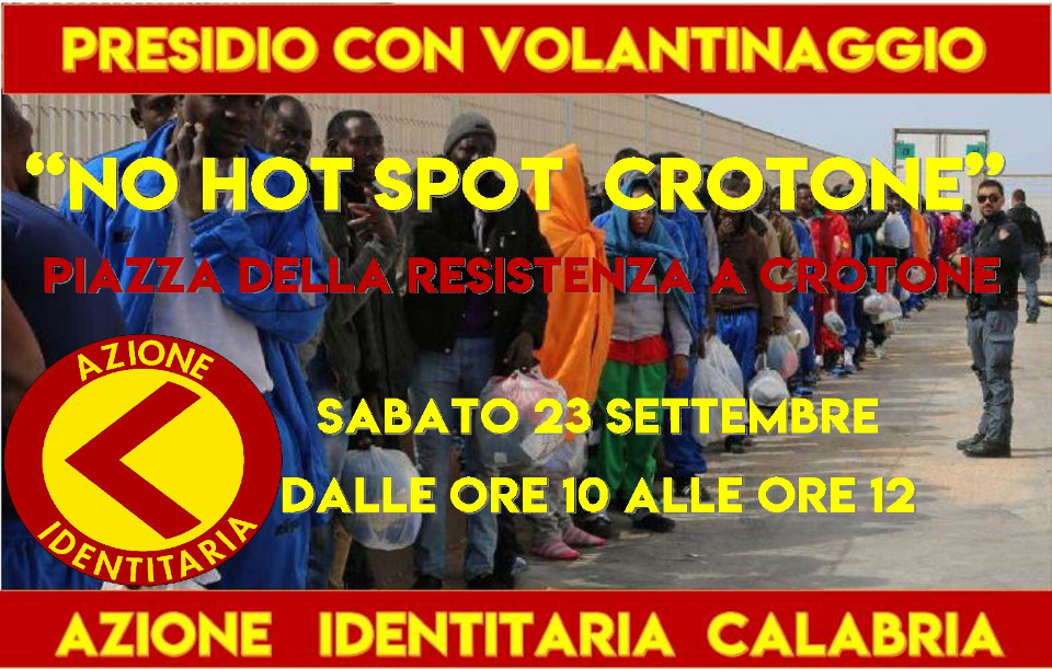 Hotspot a Crotone, Azione Identitaria sarà in piazza per informare i cittadini sui rischi per l’aperturaUna rappresentanza di Azione Identitaria Calabria sarà in piazza a Crotone sabato 23 settembre, con un presidio con volantinaggio, per informare i cittadini sui rischi che comporta l’apertura di un “hotspot” di identificazione migranti.