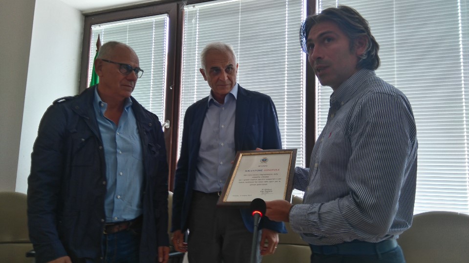 Salvatore Sinopoli e tutti i rappresentanti della Lacinia nuoto sono stati ricevuti dall’Assessore allo sport Giuseppe Frisenda che ha consegnato la pergamena a Salvatore Sinopoli e Felice Amideo.