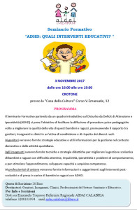 L’AIDAI Calabria, Associazione Italiana Disturbi di Attenzione e Iperattività e Disturbi Correlati, in collaborazione con l’AIDAI Lazio di Roma, organizza un Seminario Formativo “ADHD: Quali Interventi Educativi?” il 3 novembre 2017 dalle ore 16:00 alle ore 19:00 a Crotone presso La “Casa della Cultura” Corso V.Emanuele, 12.