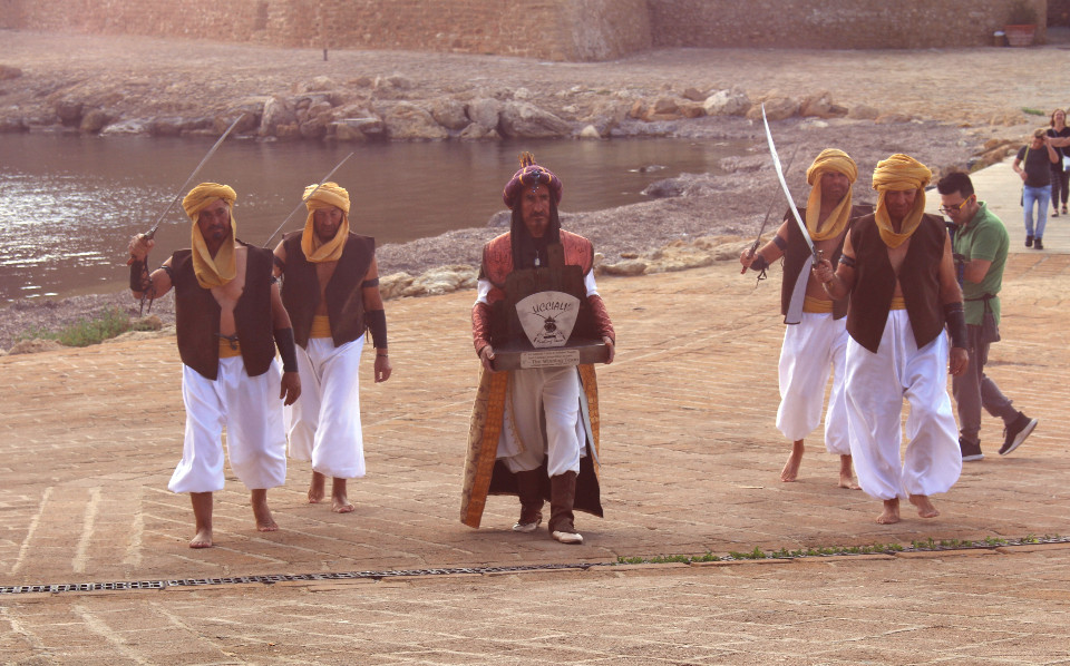 ????????????????????????????????????????????????Il momento clou della mattinata si è avuto allorquando, dopo essere stato preannunciato con fuochi d’artificio, un figurante della Associazione Artistica il Botteghino, diretto dall’artista Claudio Greco, impersonando il Corsaro Uccialì, scortato da quattro soldati saraceni, ha attraversato una nube creata da fumogeni, e con stile epico, ha portato in trionfo partendo dall’ingresso del Castello, l’esclusivo trofeo realizzato per l’occasione, riponendolo sul podio all’interno della sala, e consegnandolo metaforicamente ai partecipanti per la gara.