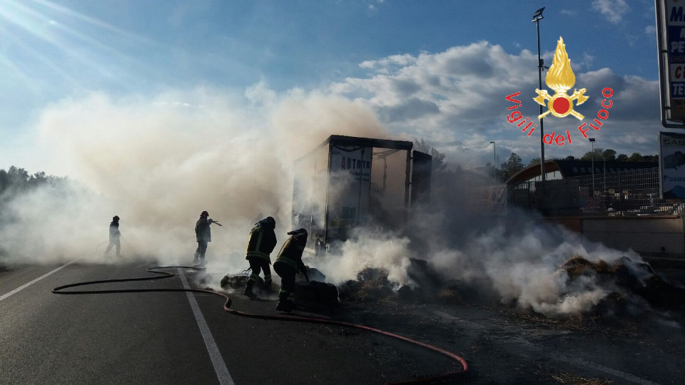 Interessato dall’incendio un automezzo carico di rotoballe di fieno che transitava sulla SS106. Le cause in corso di accertamento.