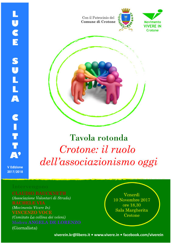 Venerdì 10 novembre Vivere In invita la città alla tavola rotonda sul ruolo dell’associazionismo oggi. Non è mai sterile né inutile riflettere sul ruolo che ogni realtà associativa, secondo la propria identità e la propria mission, hanno e devono avere per il progresso del nostro territorio.