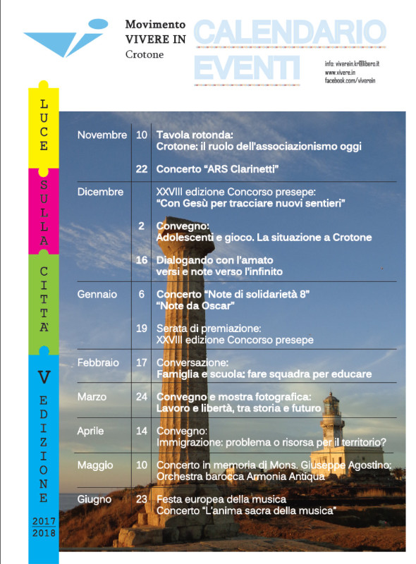 Il Movimento Vivere In propone alla città anche quest’anno il cartellone di iniziative culturali “Luce sulla città”, giunto alla quinta edizione.