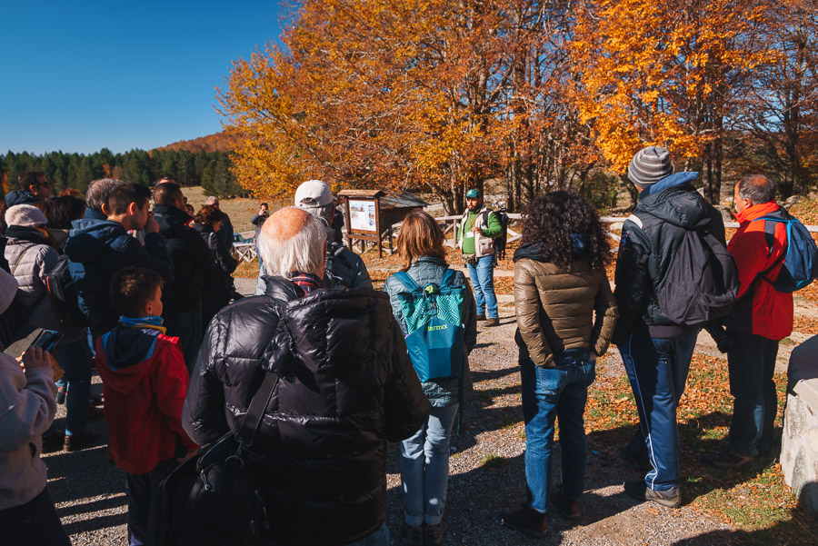 Dopo un primo giorno all’insegna del relax, ad ammirare il cielo stellato e provare la cucina tipica dei luoghi, la domenica è stata tutta dedicata al trekking. Li abbiamo accompagnati lungo il sentiero 441 del Parco, sotto il Centro Sci da Fondo Carlomagno, in una delle zone più belle per ammirare il foliage, ossia il cambio di colore autunnale delle foglie, guidati dalla Guida Ufficiale del Parco, nonché fotografo pubblicato sul National Geographic, Giuseppe Intrieri.