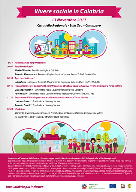 L’incontro, rivolto sia ai Comuni che al Terzo Settore, sarà organizzato in due momenti: nella prima parte, saranno presentati i bandi POR, già pubblicati, relativi al social housing e ai centri socio-educativi e saranno esaminati alcuni casi di buone pratiche sia nazionali che internazionali, nella seconda parte, invece, che proseguirà anche nel pomeriggio, saranno realizzati dei Workshop, nel corso dei quali sarà possibile discutere con i tecnici al fine di illustrare i progetti in corso e confrontarsi su specifiche problematiche emerse nella presentazione dei progetti.