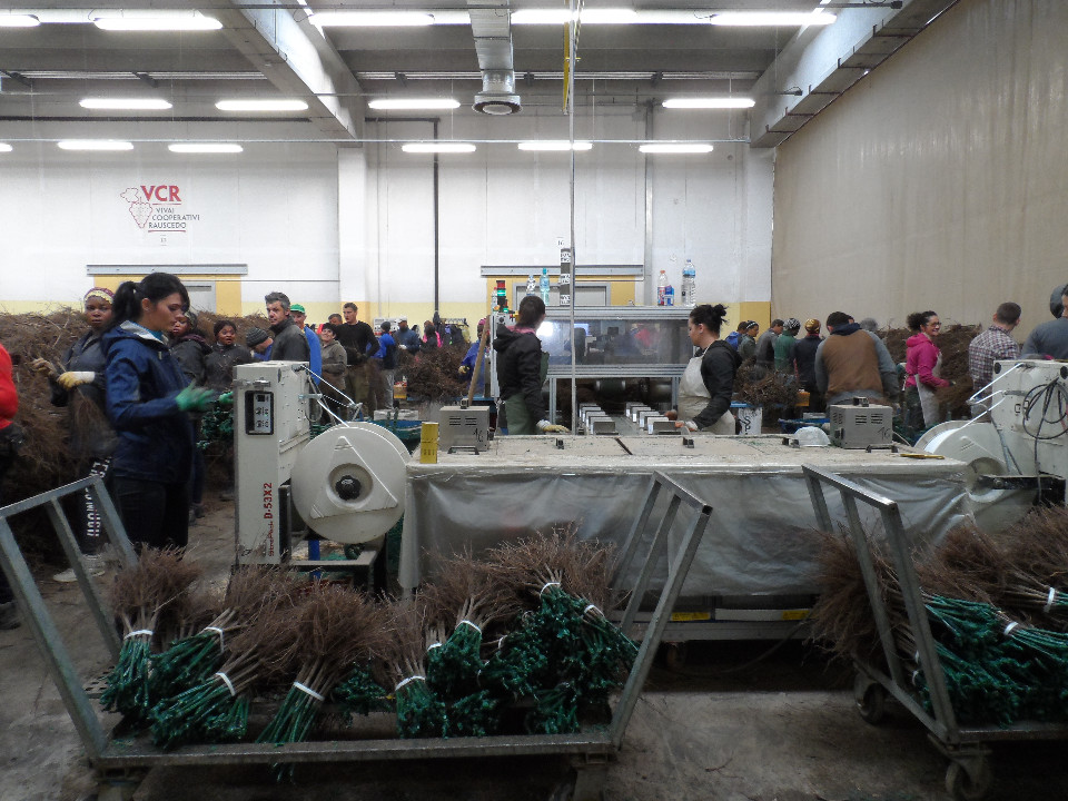 La storia ci racconta che nel 1920, a Rauscedo, piccolo paese ai piedi delle Prealpi Carniche, in un ambiente economicamente depresso e caratterizzato da emigrazioni di massa, venne a costituirsi il primo nucleo di un’attività vivaistico-viticola finché intorno al 1929/30 si diffuse l’idea che la forma associativa avrebbe risolto molti problemi e permesso una maggior produzione a prezzi remunerativi. La cortese accoglienza e la chiara competenza dalla dott.ssa Marta Colautti, responsabile certificazione e qualità del Vivaio, in pochi istanti, ha proiettato i partecipanti nel mondo del vivaismo: studiato, sperimentato e praticato. Abbiamo visionato i padiglioni di produzione delle barbatelle dove, come un alveare, 1500 persone sono organizzate dalla cooperativa nel lavoro quotidiano e in cui ogni socio responsabilmente oltre a fornire la produzione di barbatelle fornisce la propria forza lavoro. Ai Vivai Cooperativi Rauscedo, sotto il controllo degli organi direttivi della Società, sono coltivati dai 250 soci oltre 1.100 ettari di vivaio e 1.050 a portinnesti: un potenziale enorme che permette, ogni anno, di produrre circa 80 milioni di barbatelle suddivise in più di 4.000 combinazioni. La visita ha previsto l’incontro con la dott.sa Elisa De Luca responsabile del laboratorio del Centro Sperimentale VCR che effettua circa 20.000 test ELISA per assicurare il livello sanitario previsto dalle leggi in vigore sulle barbatelle commercializzate.