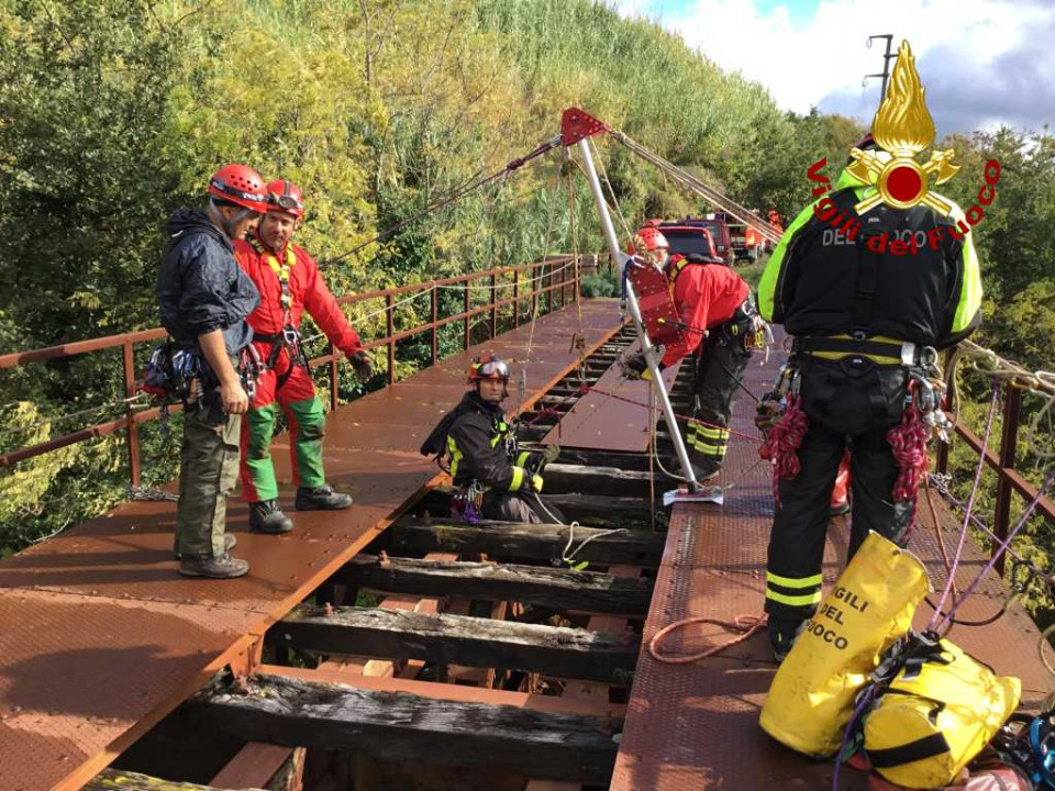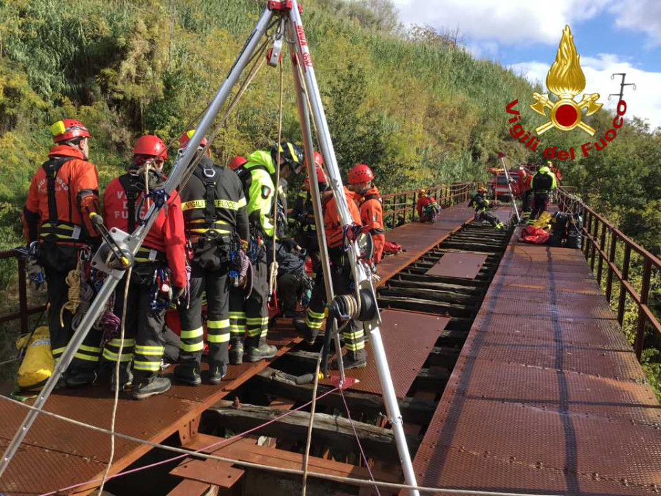 Un’addestramento su un ponte dismesso delle Ferrovie Calabro Lucane sito nel comune di San Costantino Calabro (VV), simulando il recupero di un infortunato applicando tecniche SAF avanzate con palo pescante, cavalletto cevedale e teleferiche su corda.