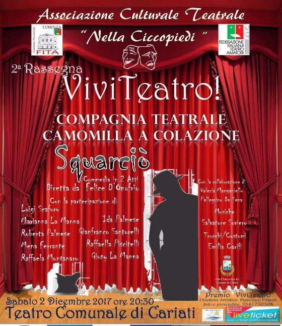 Sabato 2 dicembre 2017 alle ore 20.30, presso il teatro Comunale, avrà luogo il secondo imperdibile appuntamento con la Rassegna “Viviteatro” organizzata dall’Associazione “Nella Ciccopiedi” e patrocinata dal Comune di Cariati. Con questa serata prende il via il concorso “Viviteatro”, novità di questa seconda rassegna Cariatese: tre distinte giurie, formate rispettivamente da tecnici del settore, da giornalisti e dal pubblico in sala, assegneranno premi e menzioni speciali. Sul sipario si esibirà la Compagnia “Camomilla a Colazione” di Visciano (NA) con la commedia “Squarciò”, diretta da Felice D’Onofrio, vincitrice a Salerno del Premio “Thalia teatro” per il migliore spettacolo. “Squarciò” racconta di un ragazzo di Napoli, Pasqualino Repice, che illudendosi di risolvere le sue difficoltà economiche non trova di meglio che rivolgersi alla camorra. La mancanza di dialogo tra padre e figlio e l’incapacità di ascoltare sono le chiavi della vicenda, radicata nella cronaca attuale ma tuttavia colorata da comicità pura: una commedia agrodolce che fa sorridere e riflettere allo stesso tempo. Il gruppo campano, già noto al pubblico cariatese (nel 2015 ha presentato “Burqua” e nel 2016 “L’amore non ha sesso il brivido è lo stesso”), ha ospitato lo scorso 25 novembre la compagnia “L’arcobaleno” di Cariati, che ha presentato lo spettacolo “Il Medico dei Pazzi” per la regia di Miriam Crivaro, nella Rassegna “Vulcanicamente Premio Pad” di Visciano.