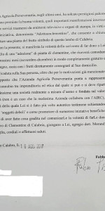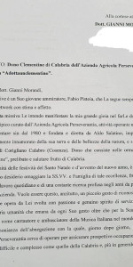 La scelta ricaduta sulla Sua persona, oltre che per le motivazioni già menzionate, nasce dal presupposto che l’Azienda Agricola Perseverantia punta a rappresentare un prezioso connubio tra imprenditoria ed etica dal quale si può e si deve ripartire per costruire insieme una società realmente a misura d’uomo e fondata sul valore della solidarietà (non è un caso che la medesima Azienda collabora con l’AIRC-Associazione Italiana per la Ricerca sul Cancro), quella solidarietà della quale Lei si è fatto più volte autentico testimone schierandosi con i cosiddetti ‘soggetti deboli’ e come promotore di numerose iniziative benefiche. Sperando di aver fatto cosa gradita nel comunicarLe la volontà di farLe dono di un quantitativo di Clementine di Calabria, giungano a Lei, egregio dott. Morandi, e alla Sua famiglia, cordiali e affettuosi saluti”.