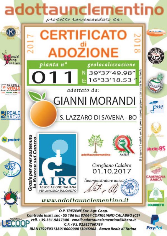 Certificato di adozione pianta n. 11 (ispirato al giorno di nascita del popolare cantante, 11 dicembre 1944) recante la data dell’1 ottobre 2017. Questi i tratti distintivi della simbolica “adozione” delle prelibate e salutari Clementine di Corigliano Calabro, vera e propria eccellenza del territorio, ad opera di uno dei personaggi del mondo della musica e dello spettacolo più amati dal grande pubblico: Gianni MORANDI.