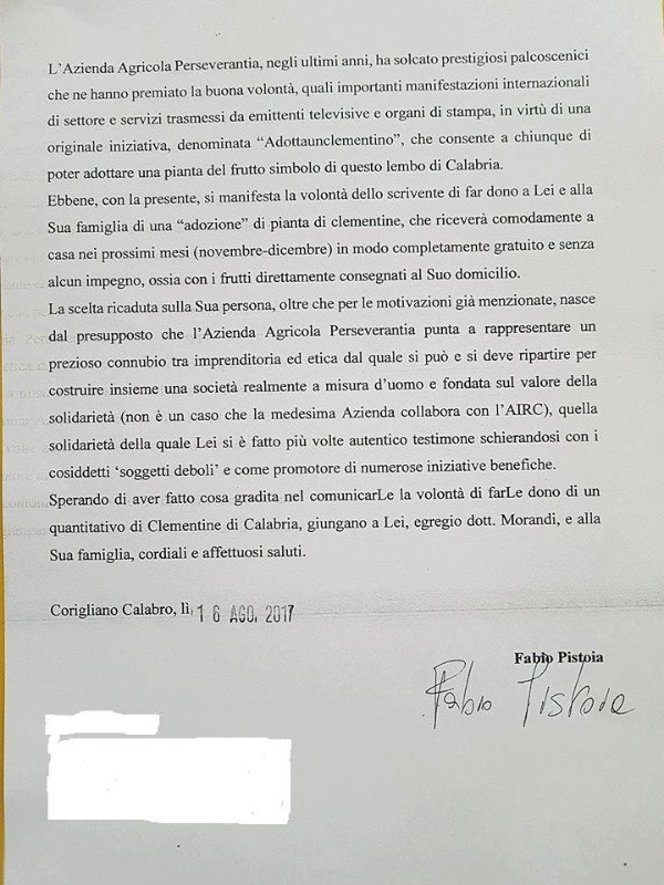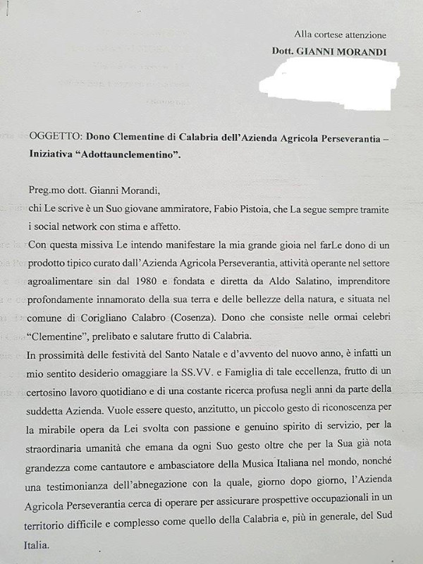 “Preg.mo dott. Gianni Morandi, – si legge nella missiva inviata al cantante nello scorso mese di agosto – chi Le scrive è un suo giovane ammiratore, Fabio Pistoia, che La segue sempre tramite i social network con stima e affetto. Con questa missiva Le intendo manifestare la mia grande gioia nel farLe dono di un prodotto tipico curato dall’Azienda Agricola Perseverantia, attività operante nel settore agroalimentare sin dal 1980, fondata e diretta da Aldo Salatino, imprenditore profondamente innamorato della sua terra e delle bellezze della natura, e situata nel comune di Corigliano Calabro (Cosenza). Dono che consiste nelle ormai celebri “Clementine”, prelibato e salutare frutto di Calabria. In prossimità delle festività del Santo Natale e d’avvento del nuovo anno, è infatti un mio sentito desiderio omaggiare la SS.VV. e Famiglia di tale eccellenza, frutto di un certosino lavoro quotidiano e di una costante ricerca profusa negli anni da parte della suddetta Azienda. Vuole essere questo, anzitutto, un piccolo gesto di riconoscenza per la mirabile opera da Lei svolta con passione e genuino spirito di servizio, per la straordinaria umanità che emana da ogni Suo gesto oltre che per la Sua già nota grandezza come Cantautore e Ambasciatore della Musica Italiana nel Mondo, nonché una testimonianza dell’abnegazione con la quale, giorno dopo giorno, l’Azienda Agricola Perseverantia cerca di operare per assicurare prospettive occupazionali in un territorio difficile e complesso come quello della Calabria e, più in generale, del Sud Italia. L’Azienda Agricola Perseverantia, negli ultimi anni, ha solcato prestigiosi palcoscenici che ne hanno premiato la buona volontà, quali importanti manifestazioni internazionali di settore e servizi trasmessi da emittenti televisive e organi di stampa, in virtù di una originale iniziativa, denominata “Adottaunclementino”, che consente a chiunque di poter adottare una pianta del frutto simbolo di questo lembo di Calabria. Ebbene, con la presente, si manifesta la volontà dello scrivente di far dono a Lei e alla Sua famiglia di una “adozione” di pianta di clementine, che riceverà comodamente a casa nei prossimi mesi (novembre-dicembre) in modo completamente gratuito e senza alcun impegno, ossia con i frutti direttamente consegnati al Suo domicilio.