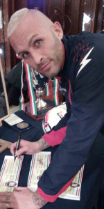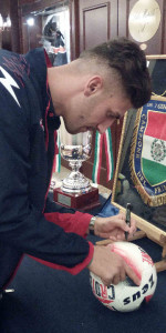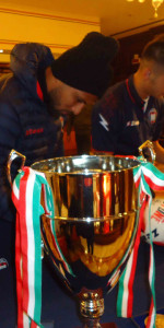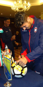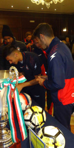 In occasione della presenza del Crotone FC a Reggio Emilia per l’incontro con il Sassuolo di domenica 10 dicembre 2017, l’Ing. Salvatore Salerno, ideatore e promotore del Premio “Campione del Primo Tricolore” e Presidente dell’omonimo Comitato, ha raggiunto la società presso il suo ritiro al fine di presentare le iniziative correlate e raccogliere le firme di tutti i giocatori, incominciando dal capitano Cordaz, e del nuovo mister Walter Zenga sui palloni che saranno destinati in beneficenza. Non solo: al capitano Alex Cordaz è stata donata una speciale fascia da capitano con le note de “Il Canto degli Italiani”.
