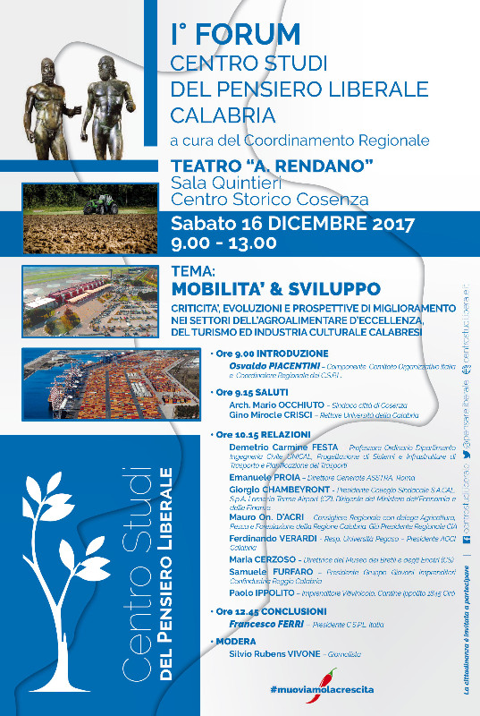 Sabato 16 dicembre 2017, dalle ore 9.00 alle ore 13.00, si terrà a Cosenza, nel prestigioso Teatro “A. Rendano”, il primo forum regionale organizzato dal Coordinamento Calabria del centro studi del pensiero liberale (in sigla C.S.P.L.), sul tema Mobilità & Sviluppo – Criticità, evoluzioni e prospettive di miglioramento nei settori dell’agroalimentare d’eccellenza, del turismo ed industria culturale calabresi.