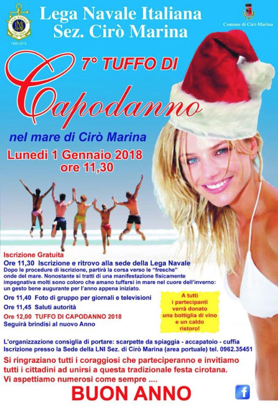 Il 2018 si aprirà con il tradizionale Tuffo di Capodanno a Cirò MarinaSuccessivamente nella sede della Lega navale italiana sarà offerto un piccolo buffet augurale, a base di panettone, pandoro, spumante e the caldi per rinfrancare i tuffatori, garantirà un brindisi di Buon Anno a tutti i partecipanti (coraggiosi e no)
