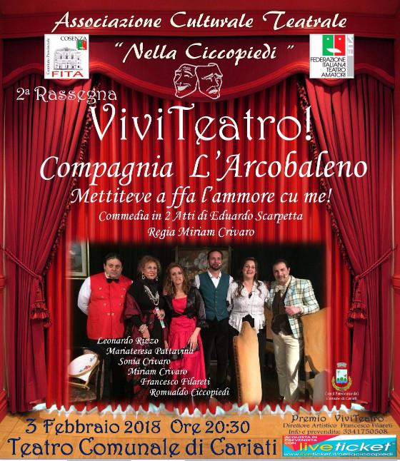 Serata in famiglia, commedia tratta da una pièce francesce di enorme successo Le prénom, diretta dal Regista Rosario Gattuso, la compagnia La Ribalta di Vibo Valentia si è esibita Sabato 20 Gennaio presso il teatro comunale di Cariati nell’ambito della Seconda rassegna ViviTeatro organizzata dall’associazione culturale Nella Ciccopiedi e diretta dal Presidente Francesco Filareti . Tra l’attenta partecipazione e le risate del pubblico gli attori con un frenetico ritmo comunicativo ed espressivo teatrale hanno sottolineato attraverso una semplice banale domanda: differenze politiche, condizioni sociali, credenze popolari e rapporti tra amici spesso velati da menzogne, condite da gratuite cattiverie e farcito da invidia e mascherato da ridicole e smorfie di totale indifferenza. 100 minuti di dialogo diviso tra due mondi, quello radical chic, “taccagno” e quello sfacciatamente ricco, elegante tendenzialmente ignorante e privo di riferimenti storico-culturali. A fine serata tra gli applausi il presidente del gruppo La ribalta Giusi Fanelli ringrazia l’attento pubblico gli organizzatori della rassegna sottolineando il legame che unisce le diverse realtà teatrali e l’importanza per esse di avere opportunità e occasioni per la crescita culturale sul nostro territorio, …attraverso la convergenza di passioni e di ispirazioni, per proporre incontri finalizzati all’aggregazione sociale e volti alla sensibilizzazione artistica per mezzo di attività teatrali e musicali.