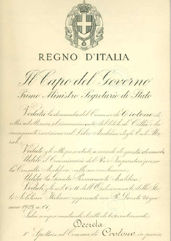 Oltre al decreto sono presenti nella sezione altri rari documenti come il Decreto Ministeriale del 30 aprile del 1903 con il quale il Ministro dell’Interno Giovanni Giolitti concedeva al Comune di “Cotrone” di fare uso dello stemma civico, il cui bozzetto grafico è realizzato a mano ed è minuziosamente descritto nel documento stesso.