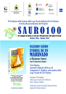 Il progetto SAURO100 farà sosta nel porto di Cirò Marina dal 6 al 8 febbraio 2018. L’ammiraglio Sauro, ormai in pensione dopo 42 anni di servizio nella Marina militare, utilizza ogni sosta per portare nelle scuole il racconto dei marinai che, con il sacrificio e l’impegno, formarono l’identità europea e nazionale portando alla conoscenza dei giovani quei valori che animarono i loro coetanei di un tempo. Attraverso la commemorazione della figura di Nazario Sauro, infatti, il nipote Romano sta promuovendo il recupero di storie, racconti e luoghi della memoria sullo sfondo del tema “la Grande Guerra sul mare”. L’obiettivo di avvicinare gli studenti alla cultura e ai valori del mare e formarli al codice marinaresco, è inoltre realizzato con la possibilità di stipulare convenzioni con le sezioni della Lega Navale Italiana, di cui Romano Sauro è stato Commissario Straordinario, permettendo, nell’ambito dei percorsi di Alternanza Scuola-Lavoro previsti dalla L.107/2015, di imbarcare studenti che sperimentino la vita di bordo nelle tratte di trasferimento da un porto a un’altro.