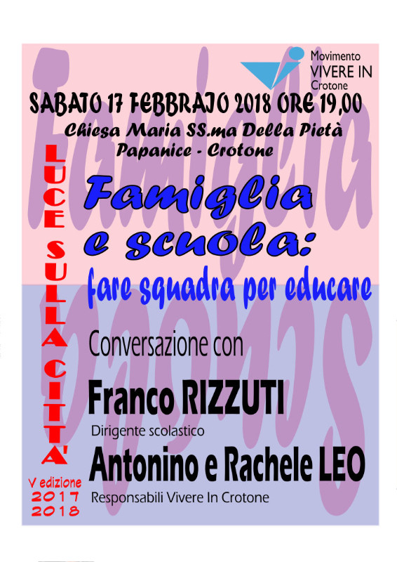 Si terrà a Papanice il settimo appuntamento del cartellone Luce sulla Città dedicato alla corresponsabilità educativa. In questo momento storico, in cui educare le giovani generazioni mette a nudo il disorientamento e la fragilità della società intera, il Movimento Vivere In vuole invitare a riflettere sul ruolo che rivestono rispettivamente famiglia e scuola in questo compito delicato e importantissimo.