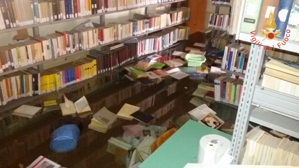 Ingenti i danni alla mobilia ed alla pavimentazione in parquet, numerosi i libri andati distrutti nonché computer ed altro materiale presente all’interno della struttura.