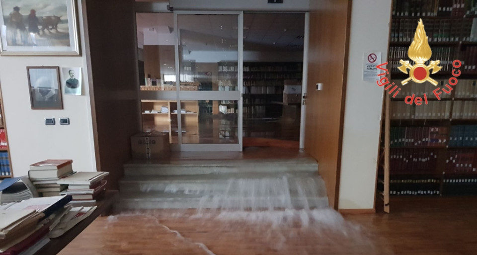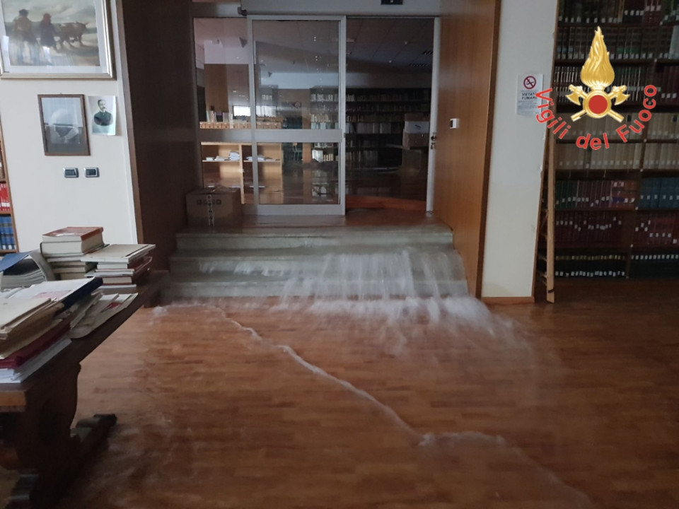 Causa la rottura di una tubazione, oltre 300 mq di locali adibiti a Biblioteca ed Auditorium sono stati completamente invasi dall’acqua. In una stanza  situato nel seminterrato l’acqua ha raggiunto circa un metro di altezza.