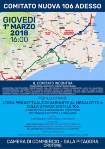 Il Comitato Nuova 106 Adesso, incontra le associazioni di categoria, i sindacati e gli ordini professionali per un confronto sui temi della mobilità, delle infrastrutture nel crotonese e sulla proposta di variante alla Strada statale 106, lanciata dal Comitato per mezzo (anche) di una Petizione popolare che ha raccolto migliaia di firme.