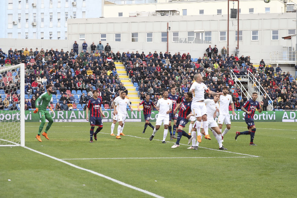 Contro una Roma ordinata con evidenti segni di stanchezza per il turno infrasettimanale di Champions League, il Crotone ha sciupato diversi occasini da gol per evitare la sconfitta pur disputando una partita senza alcun timore di fronte ai più quotati avversari. Il tabù della Roma sempre vincente e senza subire gol col Crotone non è stato abbattuto e rimangono intatte le preoccupazioni a proposito della salvezza. Crotone in campo fin dall’inizio con gli stessi undici che hanno sconfitto la Sampdoria la precedente giornata. L’impegnativa sfida di martedì scorso con lo Shaktar ha indotto mister Di Francesco ad un ampio turnover. Fuori l’ex Florenzi, Manolas, Strootman, lo squalificato De Rossi, Under e Schik ed inseriti Peres terzino destro, Fazio difensore centrale, Gonalons centrale davanti alla difesa, Pellegrini centrocampista esterno, Gerson e Dzeco insieme a El Shaarawy come trio d’attacco. La migliore qualità tecnica degli ospiti si evince per quasi tutto il primo tempo con giocate che costringono i locali a rimanere spesso nella propria metà campo. Kolarov sempre pericoloso con le incursioni lungo la fascia sinistra, Naiggolan a centrocampo detta i tempi delle ripartenze e Dzeco un continuo pericolo in area avversaria. L’uscita di Nalini per infortunio sostituito da Barberis non cambia l’atteggiamento del Crotone per quanto riguarda il modulo (4-5-1) con Stoian, Benali, Mandragora, Barberis, Ricci centrocampisti. La migliore giocata dei pitagorici al minuto trentatré quando una triangolazione Faraoni, Ricci, Stoian, non trova pronto quest’ultimo per mettere dentro il pallone. Sei minuti dopo la Roma passa in vantaggio. Dalla sinistra Kolarov crossa per El Shaarawy che da dentro l’area non ha alcuna difficoltà a mettere dentro, minuto trentanove. Meglio ha fatto il Crotone nella ripresa dopo aver evitato di subire al minuto cinquantuno il raddoppio per errore nella conclusione di Dzeco prima e Naiggolan dopo. Non è meno grave l’errore di Trotta al minuto cinquantasei quando, presentatosi tutto solo davanti a Allison lo grazia calciandogli il pallonne addosso. È ancora Crotone al minuto sessantesei che potrebbe pareggiare con Stoian ma con conclude in rete l’ottimo assist di Ricci. Gol sbagliati, gol del raddoppio subito. Naiggolan da dentro l’area trafigge Cordaz al minuto settantacinque. L’ingresso in campo della seconda punta Simy, non ha cambiato il corso della partita e da stasera, dopo i risultati ottenuti dalla Spal contro la Juve e quello del Sassuolo contro l’Udinese, la parola d’ordine dei pitagorici dovrà essere lottare a testa bassa fino al termine della stagione per raggiungere il traguardo della salvezza. Migliori pitagorici in campo Martella in difesa, Ricci a centrocampo e quando si proiettava in attacco. Incolpevole Cordaz per i gol subiti.