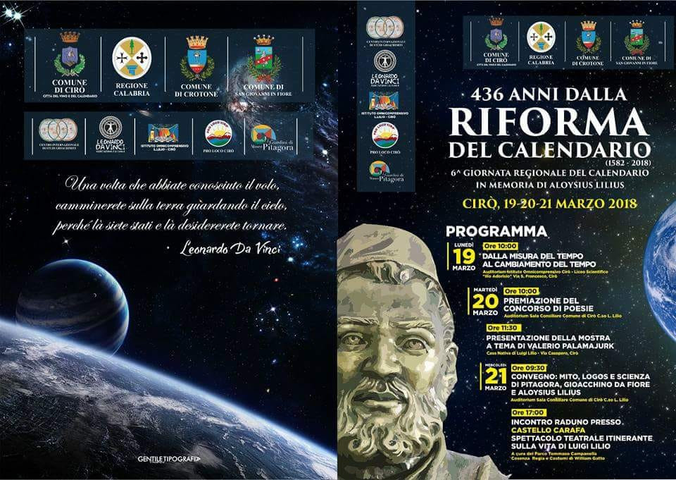 436 ANNI DALLA RIFORMA DEL CALENDARIO (1582 – 2018). – L’evento regionale dedicato ad uno dei marcatori identitari più importanti e riconosciuti della Calabria nel mondo, in programma fino a MERCOLEDÌ 21 MARZO – EQUINOZIO DI PRIMAVERA, patrocinato oltre che dalla Regione Calabria è patrocinato anche dai Comuni di SAN GIOVANNI IN FIORE e di CROTONE è promosso in collaborazione con il Centro Internazionale di STUDI GIOACHIMITI, l’associazione culturale LEONARDO DA VINCI, l’Istituto Omnicomprensivo LUIGI LILIO di Cirò, la PROLOCO CIRÒ ed il Museo I GIARDINI DI PITAGORA. – Domani MARTEDÌ 20, alle ORE 10 nella Sala Consiliare si terrà la cerimonia di premiazione del CONCORSO DI POESIE per le scuole. Alle ORE 11,30 nella casa nativa di LILIO di Via CASOPERO, sarà presentata la mostra a tema di Valerio PALAMAJURK.