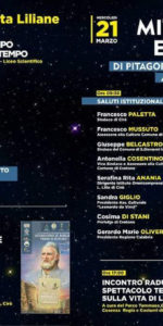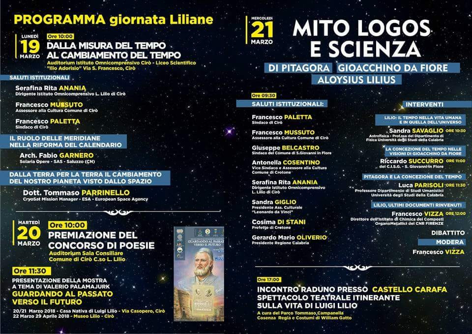 MITO, LOGOS E SCIENZA DI PITAGORA, GIOACCHINO DA FIORE E ALOYSIUS LILIUS. È, questo, il titolo dell’incontro che si terrà nella giornata conclusiva, MERCOLEDÌ 21, alle ORE 9,30 nella Sala Consiliare. Moderati da Francesco VIZZA, Direttore dell’Istituto di Chimica dei Composti organometallici del CNR di Firenze, oltre agli amministratori ed alla dirigente scolastica ANANIA, interverranno anche il Primo Cittadino di S.Giovanni in Fiore Giuseppe BELCASTRO, il vicesindaco e assessore alla cultura di Crotone Antonella COSENTINO, Sandra GIGLIO, Presidente dell’Associazione Culturale Leonardo DA VINCI, il Prefetto di CROTONE Cosima DI STANI ed il Presidente della Giunta regionale Mario OLIVERIO. – Alle ORE 10,30 l’astrofisica Sandra SAVAGLIO relazionerà su LILIO: IL TEMPO NELLA VITA UMANA E IN QUELLA DELL’UNIVERSO. Alle ORE 11 Giuseppe Riccardo SUCCURRO, Presidente del C.I.S.G. di S. GIOVANNI IN FIORE relazionerà su LA CONCEZIONE DEL TEMPO NELLE VISIONI DI GIOACCHINO DA FIORE. – PITAGORA E LA CONCEZIONE DEL TEMPO, è il titolo del tema sul quale interverrà, alle ORE 11,30 Luca PARISOLI, Professore del Dipartimento di Studi Umanistici dell’UNICAL. Concluderà VIZZA su LILIO e gli ULTIMI DOCUMENTI RINVENUTI. – Alle ORE 17 dal CASTELLO CARAFA partirà lo spettacolo teatrale itinerante: la tradizionale rappresentazione della scena della TAVOLA DELLA BICCHERNA curata dal Parco Tommaso CAMPANELLA di Cosenza, con la regia ed i costumi di William GATTO. L’evento sarà concluso con l’ANNULLO FILATELICO a cura di POSTE ITALIANE.