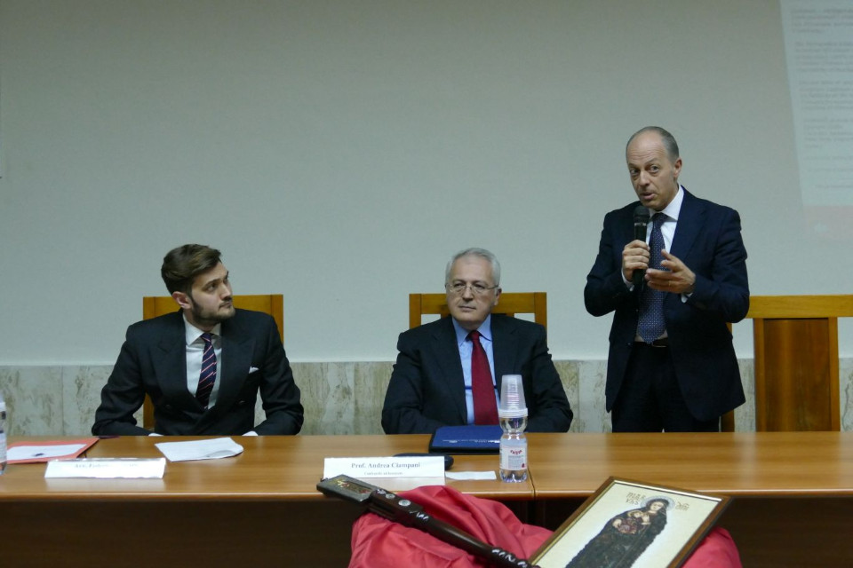 Giovedì 22 marzo alle ore 17.30 presso l’Aula Magna dell’Istituto “Benedetto XVI” nella Curia Arcivescovile, si è svolta la solenne Cerimonia “In Unum Convenientes” per il Conferimento del Titolo di Confratello ad honorem con la motivazione “in bono communi promovendo, pro scientiae et educationis meritis”, ad Andrea Ciampani , Ordinario di Storia Contemporanea e Storia del Movimento Sindacale presso l’Università LUMSA di Roma.