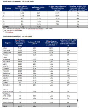 A livello regionale, il numero più alto di aziende dell’industria alimentare si registra nelle province di Reggio Calabria con 1.156 imprese attive (+0,2% sul 2016) e Cosenza con 1.109 (+0,5%). Seguono Catanzaro con 501 (-1,8%), Crotone con 285 (-1%) e Vibo Valentia con 261 (-0,4%).