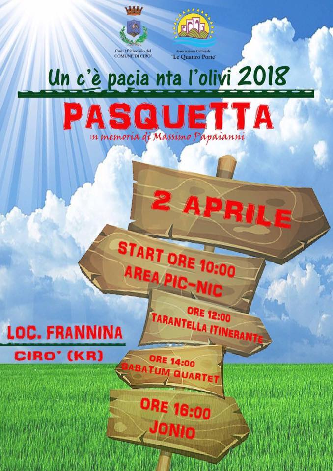 Massimo Papaianni, grande attivista dell’associazione, scomparso prematuramente nell’Aprile 2013. Rilanciare e far riscoprire le tradizioni popolari, attraverso la valorizzazione delle risorse artistiche, musicali, culturali, gastronomiche e naturalistiche. Questi gli obbiettivi dell’Associazione Culturale “Le Quattro Porte” che, con il patrocinio del Comune di Cirò rinnova la grande manifestazione all’aperto. Un evento straordinario da trascorrere insieme nella bucolica “Location” immersa tra gli ulivi secolari in Località Frannina Cirò dalle ore 10,30. Molte sono le novità di quest’anno:” area pic-nic immersa nel verde e tra gli ulivi secolari con bar e food;- dalle ore dodici “tarantella itinerante”; seguirà alle ore quattordici musica dal vivo con i: “sabatum quartet”, un gruppo che nasce nel 2005 da un’ idea di Trieste Marrelli, Roberto Bozzo e Antonio Ungaro diventa Quartet con l’ingresso della flautista Rosa Mazzei, a fine 2006 raggiunge la connotazione attuale di sette elementi con l’inserimento in ordine di Michele Petrone, Cislengo Ungaro e Arcangelo Pagliaro.