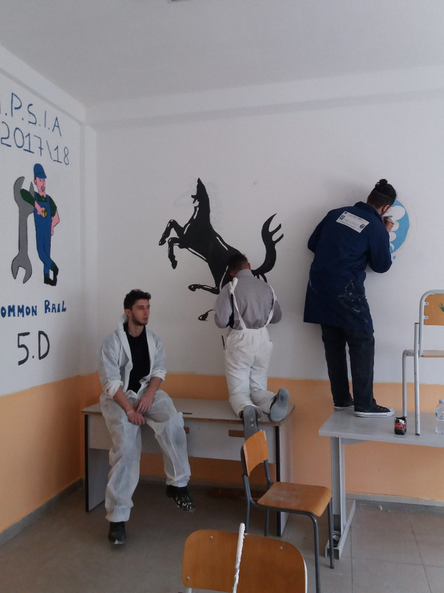 E’ stato un lavoro di gruppo, sotto la super visione dei docenti, ognuno con un ruolo ben definito. Dapprima sono state tamponate con stucco, gli angoli smussi, riempiti fessure e ricostruiti gli intonaci cadenti. Poi tutti insieme hanno scelto il colore e deciso quale logo rappresentare nella classe. Tra i disegni realizzati: il Toro simbolo della Lamborghini, della BMV, della Fiat, dei Meccanici, ma anche i simboli dei termoidraulici, come le Pale eoliche, impianti elettrici e termoidraulici. Sono stati tre giorni in cui tutti gli alunni, hanno lavorato con entusiasmo e dedizione al settore d’appartenenza, con creatività e nello stesso tempo, rispettando le regole della condivisione e dello stare insieme. Tutte le aule ora sono state ridipinte, pulite ed imbiancate dai discendi, i quali, hanno dimostrato un alto livello di educazione, considerando questa pratica fondamentale per lo sviluppo delle competenza sociale e civile. Tutti gli alunni sono stati apprezzati sia dal corpo docenti che dalla Dirigente Scolastica Laura Laurendi entusiasta per i lavori realizzati e per gli ottimi risultati ottenuti.