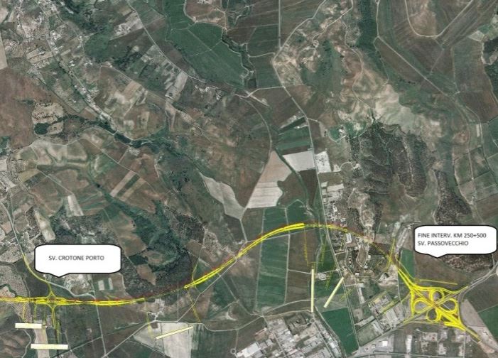 Lungo il tracciato dell’intervento sarebbero presenti 3 svincoli (Crotone-Papanice all’inizio e Crotone Porto a metà tracciato circa, entrambi nuovi e Passovecchio, esistente da adeguare e completare realizzando uno schema a quadrifoglio)
