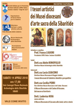 Sabato 14 aprile 2018, alle ore 17.00, a Cassano allo Ionio (Cosenza), presso la Sala convegni del Museo Nazionale Archeologico della Sibaritide, si terrà un incontro sul tema I tesori artistici dei musei diocesani d’arte sacra della Sibaritide.