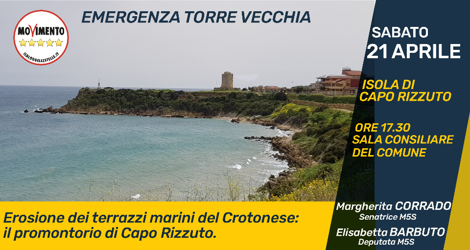 Sabato 21 aprile 2018, alle ore 17:30, la senatrice Corrado e la deputata Barbuto del M5S, saranno ad Isola Capo Rizzuto (Sala Consiliare), in un incontro pubblico per puntare i riflettori sul problema del disfacimento del braccio del promontorio di Capo Rizzuto su cui insiste la Torre Vecchia e in generale della problematica dell’erosione dei terrazzi marini del Crotonese.