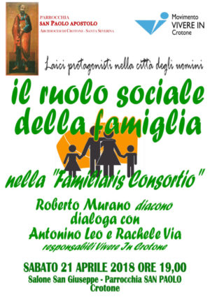 L’incontro, che vedrà dialogare il diacono Roberto Murano con i coniugi Antonino Leo e Rachele Via, responsabili di Vivere In a Crotone, vuole essere un momento di riflessione per riscoprire e promuovere il ruolo della famiglia nell’attuale contesto sociale.
