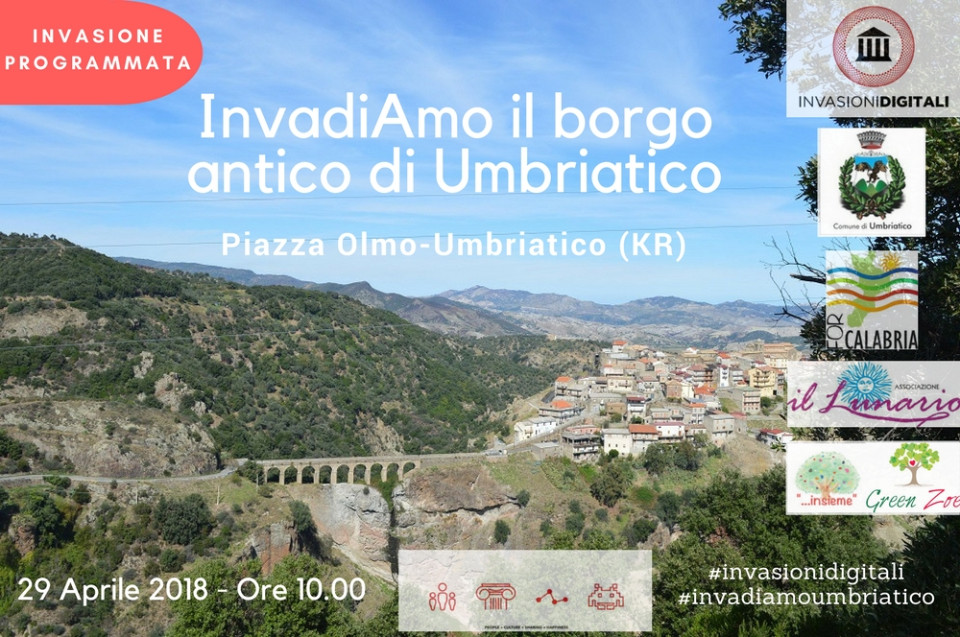 Questo evento di promozione culturale, permette a tanti borghi e luoghi culturali italiani ricchi di storia e di cultura di essere conosciuti e visitati dal pubblico, considerato che gli stessi sono poco noti al grande pubblico. Il meccanismo di condivisione delle foto in maniera live sui profili social di ogni “invasore culturale” permette di far conoscere e portare curiosità sul luogo visitato agli amici o followers del visitatore. Ad oggi, su tutto il territorio nazionale ci sono circa 120 “Invasioni Digitali” programmate, di cui 9 invasioni previste sul territorio calabrese. Questo anno, l’associazione di promozione sociale For Calabria di Castelsilano, giunta alla sua quinta partecipazione, insieme alle associazioni di volontariato “Green Zoe” di Caccuri e all’associazione “…insieme” di Isola di Capo Rizzuto hanno fatto ricadere la loro scelta di “Invasioni Digitali” sull’antico borgo di Umbriatico. Questo borgo, dell’entroterra della provincia di Crotone, merita di essere invaso e scoperto perché ricco di storia, tradizioni e di un importante patrimonio culturale e naturalistico. Ad Umbriatico, l’evento si svolgerà giorno 29 aprile, e gli amanti della macchina fotografica invaderà pacificamente Umbriatico per scoprire il paese, il suo centro storico, le sue chiese e le sue tante bellezze culturali. Il luogo del ritrovo è in Piazza Olmo, muniti di macchina fotografica e fotocamere o smartphone per immortalare, condividere e far conoscere a tutti questo affascinate borgo, erede della città Magnogreca di Bristacia (700 a.C.). L’Associazione organizzatrice For Calabria, hanno già ringraziato il sindaco del Comune, Rosario Pasquale Abenante, le associazioni locali “il Lunario” e “Trame”, l’Ufficio Comunicazione guidato da Alfonso Calabretta che li ospiterà e supporterà nell’organizzazione e per la buona riuscita dell’evento.
