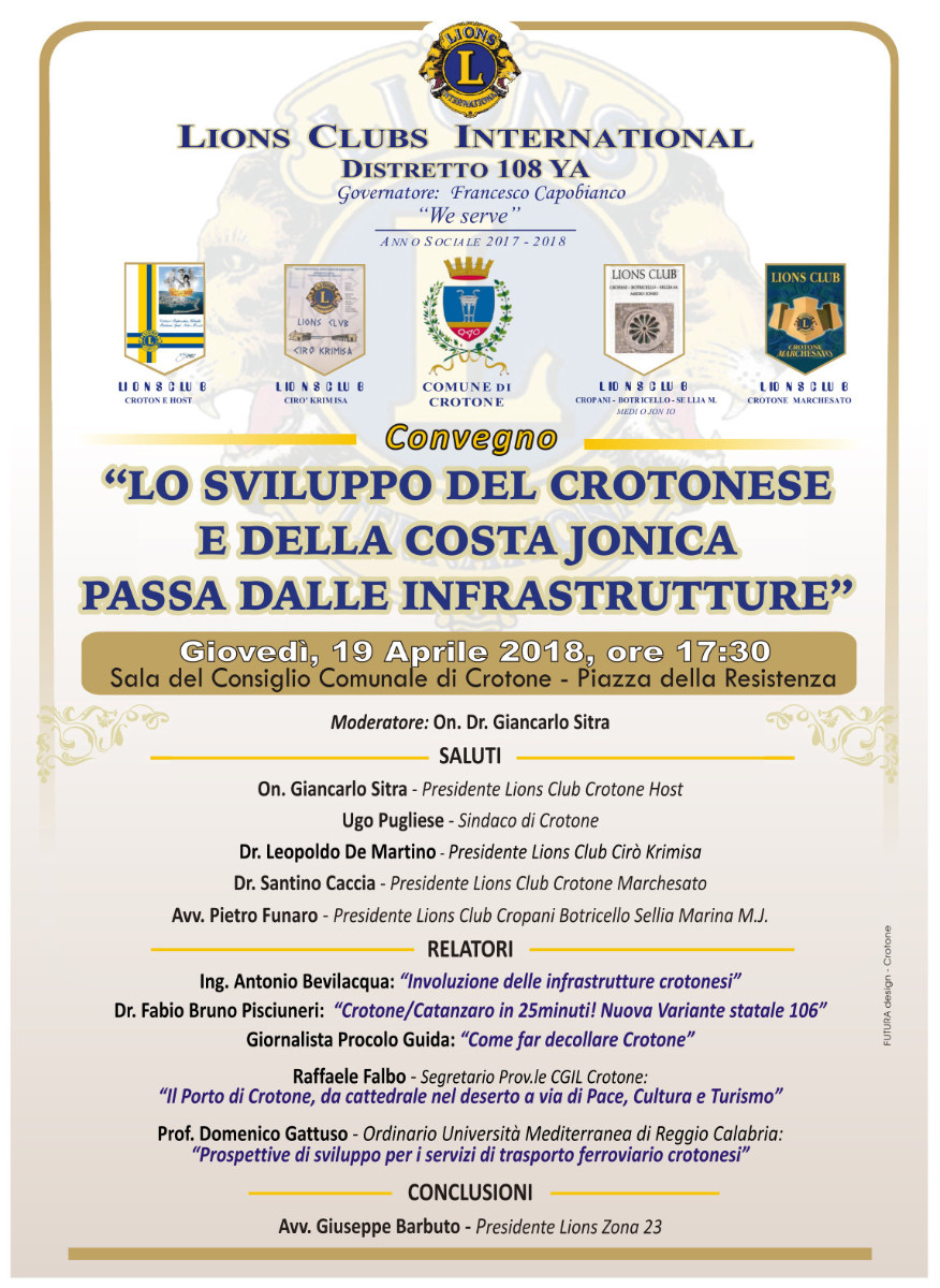 Non tocca certo al Lions sostituirsi alle Istituzioni deputate a trovare le cure per sanare le malattie del proprio territorio, ma da Associazione di Volontariato più grande del mondo a Noi tocca servire i bisognosi ed i nostri territori: in questo quadro la nostra iniziativa vale a suonare la sveglia nel tentativo di sensibilizzare le Istituzioni ed a mettere a loro disposizioni, come facciamo con questa iniziativa, le competenze eccellenti che il nostro territorio esprime e trovare insieme la via del nuovo sviluppo e non c’è dubbio che senza vie di comunicazioni non può esserci sviluppo. Quindi le infrastrutture rappresentano la prima condizione strategica dello sviluppo. Ammodernate e rese funzionanti le infrastrutture tutto è più facile, perché per fortuna il nostro territorio ha tutti gli ingredienti per essere rilanciato senza aiuti esterni: il mare e la costa, la montagna, l’agricoltura ed i suoi prodotti tipici, la sua storia dalla Magna Grecia ad oggi, i beni culturali, gli itinerari religiosi, la ricca presenza giovanile, etc., tutto ciò si traducono in una sola parola di sviluppo: Turismo.
