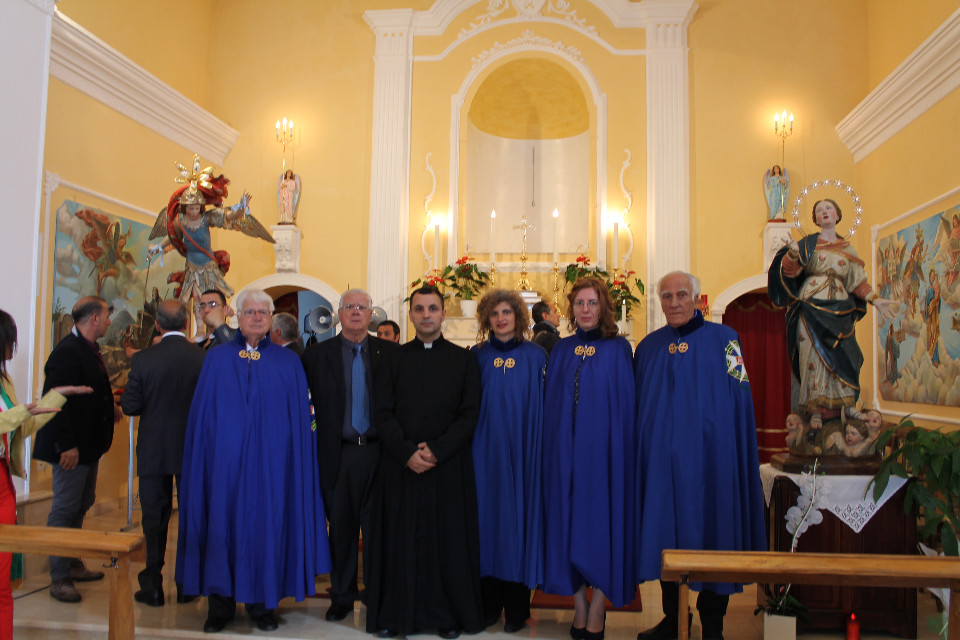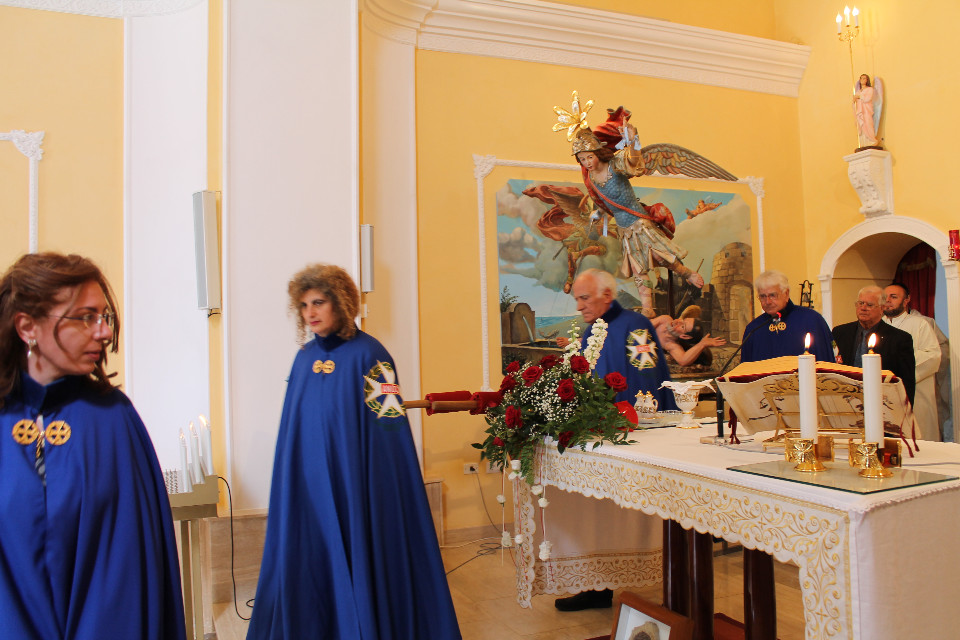 Il parroco e il Diacono Franco, onorati dai soci Anioc: Cav. Carlo Luigi Crea, dal Cav. Alberto Prin Abbelle, dalla Dama Michelina De Franco e dalla Signora Sanà Kishek, (nata in Palestina–Terra Santa), vestiti con il mantello dell’associazione, sono stati accompagnati, dalla sacrestia esterna in processione passando dalla navata centrale fino all’altare.