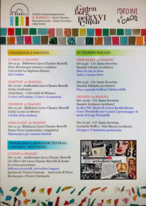Alla luce di questo l’I. O. “Diodato Borrelli” di S. Severina ancora una volta ha accettato la sfida accogliendo la sedicesima edizione del Progetto Gutenberg dal 21 al 26 maggio sul tema “L’ Ordine e il Caos”.