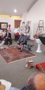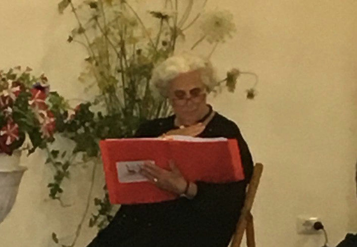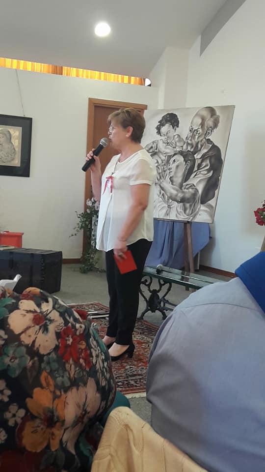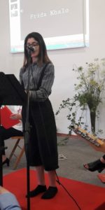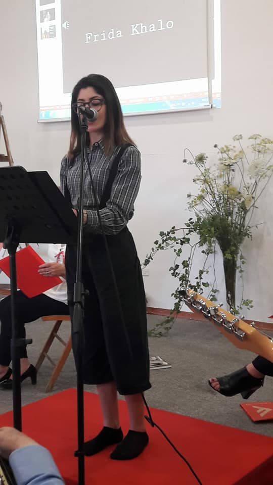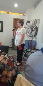 Ha proposto Amuri Amuri e Luna Lunella e nella sala l’emozione eil coinvolgimento erano tangibili, accompagnata dai maestri Cataldo Amoruso e Giuseppe Pipita; altro ospite con la sua arte teatrale la dolce e immensa Rosita Tangari dell’Accademia Progetto Teatro che ha proposto un piccolo monologo dello spettacolo “La Guerra di mio nonno”; la stessa lettrice del Circolo che ha letto di Frida Khalo con passione, interpretando il suo essere ribelle e colorata è stata la terza artista Giovanna Semerano, pittrice autodidatta, fotografa amatoriale ha partecipato ad espositive e concorsi in entrambi le categorie con riconoscimenti. Premio Alda Merini 2017. Ha esposto opere eseguiti a puntinismo, china su carta, e particolare del Tondo Doni di Michelangelo olio su tela con la tecnica del monocromo, dove il bianco è la tela stessa.