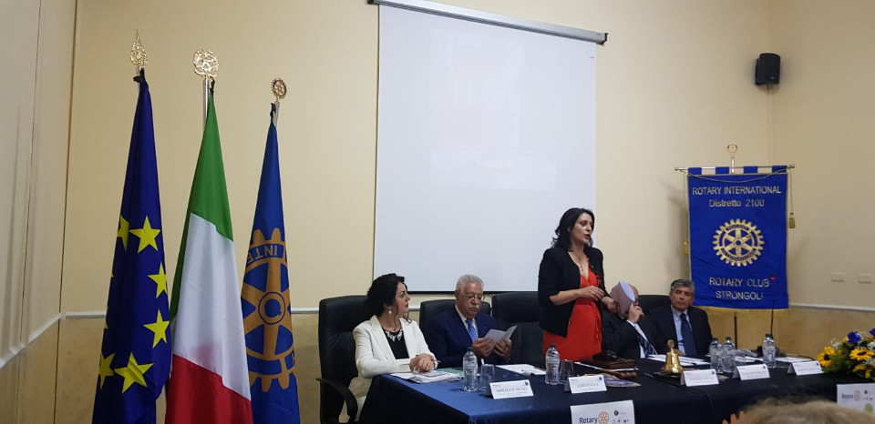 Il Presidente del Club, Stefania Leotta, dopo gli Inni e Onore alle bandiere, ha brevemente illustrato il ruolo del Rotary nel mondo e in particolare nel territorio strongolese per ciò che riguarda la salute e non solo chiudendo la sua breve introduzione con l’invito ad una diffusione della conoscenza in maniera corretta quale dovere del service del Rotary e delle Istituzioni.