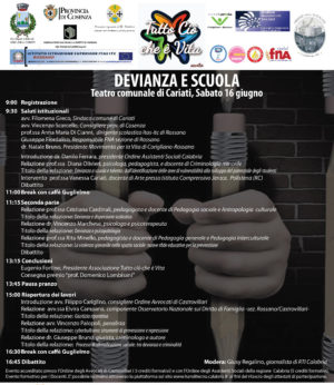 L’Associazione Culturale di Volontariato Tutto ciò che è Vita e il Presidente Eugenio Fortino, in ossequio ai principi statutari associativi, sono lieti di presentare il Convegno Formativo “Devianza e Scuola” che si terrà sabato 16 giugno presso il cinema-teatro di Cariati(cs). Tale evento si propone di perseguire l’obiettivo primario di sensibilizzazione del “mondo degli adulti”, potenziali educatori, al fine della tutela dei minori. Inoltre, grazie agli autorevoli relatori che interverranno, offrire ai professionisti che interagiscono con minori devianti, alcuni strumenti conoscitivi e di intervento.