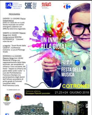 Il MIBACT con questa iniziativa intende favorire l’integrazione, la cultura, la partecipazione, l’armonia attraverso la musica, qualsiasi tipo ed in ogni luogo: piazze, musei, parchi, ospedali, carceri, metropolitane e strade.A COTRONEI è stato boom di adesioni. Sono tantissimi gli artisti emergenti calabresi iscritti che GIOVEDÌ 21 in piazza INDIPENDENZA, dalle ORE 18 alle ORE 24, si esibiranno durante la serata musicale. L’evento verrà trasmesso in differita televisiva regionale su CALABRIA TV sul format DIETRO L’EVENTO, presentato da Antonella PEZZETTA. Sarà presente anche una rappresentanza della squadra femminile di Volley del BLUE ANGELS di COTRONEI, neopromossa in serie D.