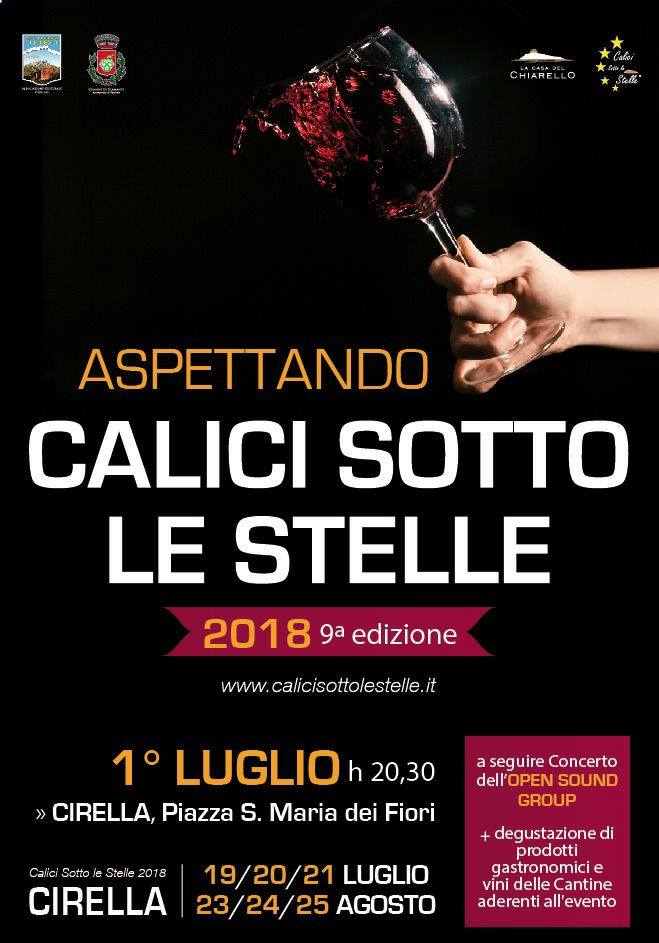 Per dare un assaggio della manifestazione e presentare le novità che si prospettano per la nona edizione, domenica 1° luglio, alle ore 20:30, si terrà, in Piazza S. Maria dei Fiori a Cirella, un attesissimo pre-evento dal titolo “Aspettando Calici Sotto le Stelle 2018”, che si articolerà in una serata musicale d’èlite con gli Open Sound Group e una breve presentazione dell’evento a cura degli organizzatori e dell’Amministrazione Comunale di Diamante, ente patrocinante, a cui faranno seguito ampie degustazioni di prodotti tipici e deliziosi assaggi di vini delle cantine aderenti a Calici 2018, il tutto nella suggestiva cornice del centro storico di Cirella.
