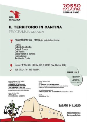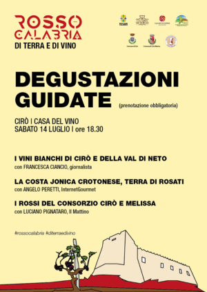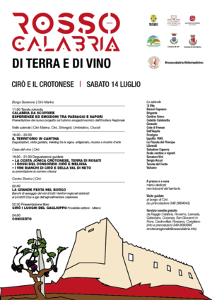L’intera giornata di sabato 14 luglio sarà focalizzata sul nuovo progetto di percorso enogastronomico promosso dall’Enoteca regionale e sulle iniziative di scoperta del territorio e dei suoi vini, dai tasting al trekking sulle vigne, a cura delle cantine ‘A Vita, Baroni Capoano, Brigante, Cantine Greco, Cataldo Calabretta, Ceraudo, Cote di Franze, Dell’Aquila, Du Cropio Winery, Fezzigna, Ippolito 1845, La Pizzuta del Principe, Librandi, Salvatore Caparra, Scala Cantina e vigneti, Senatore vini, Sergio Arcuri, Tenuta del Conte, Vulcano. La Casa del Vino di Cirò invece ospiterà degustazioni guidate da esperti e critici del vino: ‘La Costa Crotonese terra dei Rosati’; ‘I Rossi del consorzio Cirò e Melissa’; ‘ I vitigni a bacca bianca del Crotonese’.