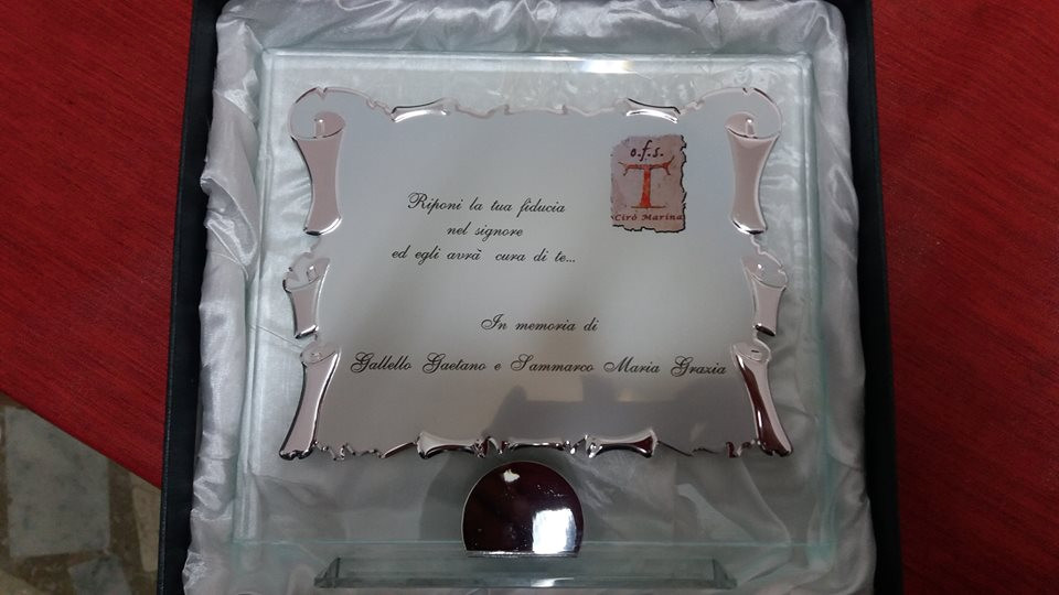 Presenti tutti i figli e le figlie: Mena, Rosetta, Anna, Francesca, Antonio, Cataldo, Luciano, i generi Pino e Gennaro, la nipote Rita. Don Gianni Filippelli, padre spirituale di Maria Grazia Sammarco Gallello, è sempre stato vicino a lei, così come, prima di lei, al marito Gaetano Gallello, portando il suo conforto e la sua buona parola, accompagnandoli in serenità, fino alle braccia di Dio e dando conforto, con la sua presenza, a tutta la famiglia. Don Gianni ha ricordato Maria Grazia, il suo attaccamento alla chiesa, il corredino di Gesù Bambino, che aveva ricamato per il presepe della Chiesa di San Cataldo, l’abito cucito per la Madonna Addolorata e l’Abito che aveva cucito insieme alla figlia Francesca, per la Madonna del Carmelo ed il Bambino Gesù, il Crocifisso in legno, così come lo scialle, da lei lavorato, che in sede è stato sorteggiato. Piccoli gesti, piccoli pensieri che rendono grande un gesto d’amore verso la Chiesa. La Ministra Maria Barone, commossa, ricordando la sorella francescana, ha ricordato le sue parole di forza, di esperienza, di sorellanza, che tanto hanno significato per lei e per tutte le sorelle. Un affetto ed un vuoto che rimarrà impresso nei cuori di quanti hanno conosciuto Maria Grazia Sammarco e suo marito Gaetano Gallello. Nella targa, infatti, sotto la magnifica frase di San Francesco d’Assisi “ Riponi la tua fiducia nel Signore ed Egli avrà cura di te”, vicino al nome di Maria Grazia Sammarco, è inciso anche il nome di Gaetano Gallello, suo compagno di vita, cittadino Benemerito di Cirò Marina. A ringraziare a nome di tutta la famiglia Gallello, la figlia Francesca che, commossa e grata per quanto affetto, stima ed onore, sono stati dimostrati dalla Fraternità Francescana alla famiglia Gallello, rivolgendo il suo grazie a Don Gianni Filippelli, Frate Massimo, Frate F. Lancillotto, Suor Natalina, l’amica e sorella francescana Rina, tutte le sorelle francescane e la Ministra Maria Barone, ha ricordato di quanto, Maria Grazia e Gaetano, siano stati genitori, nonni e suoceri amorevoli.
