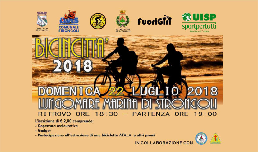 E’ Tutto pronto per la V^ manifestazione “Bici in Città 2018”. La bicicletta e gli appassionati alle due ruote ritorneranno protagonisti nelle strade della marina di Strongoli con l’arrivo della nuova stagione estiva. L’iniziativa è stata organizzata da quattro associazioni di volontariato, che hanno lavorato senza finalità di lucro: la FuoriGiri di Crotone, la Pro Loco di Strongoli, l’UISP, l’AVIS di Strongoli e la Strongoli Bike, con il patrocinio del Comune di Strongoli. Complessivamente saranno circa 6 i chilometri da percorrere con ciclisti di tutte le età.