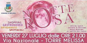 Venerdi 27 luglio a partire dalle ore 21:00, la via Nazionale si vestirà di rosa per il settimo anno consecutivo. L’appuntamento della notte rosa è ormai quasi una tradizione per la popolazione locale ma anche per i turisti abituali. Uno degli eventi più importanti della stagione melissese organizzato dalle attività commerciali e patrocinato dal Comune. Un evento nato per dare rilevanza alle tante attività commerciali, gestite da donne imprenditrici e che ormai è divenuto parte integrante e immancabile del programma estivo. Numerosi, saranno gli ospiti d’eccezione, come gli artisti del fuoco, il Mago Merlino e i bagnini di Riccione, oltre ai tanti punti di spettacolo e ovviamente tante possibilità per lo shopping e per il ristoro. La festa, come sempre, si svilupperà per tutta la via Nazionale con l’allestimento di numerosi stand per l’esposizione dell’artigianato locale.