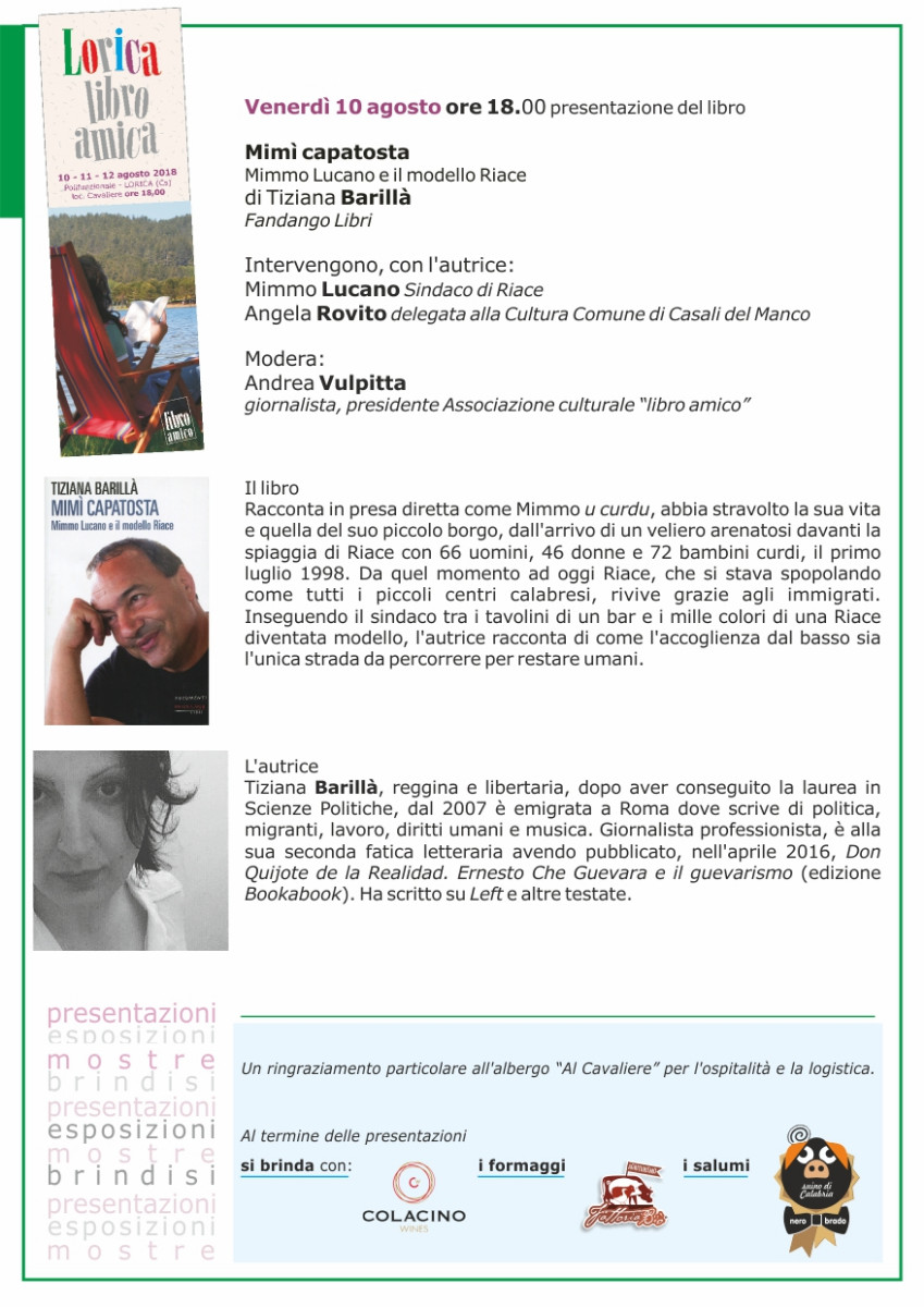 Il programma prevede per venerdì 10 agosto la presentazione del libro “Mimì Capatosta – Mimmo Lucano e il modello Riace” di Tiziana Barillà (Fandango libri), con la presenza dell’autrice, del sindaco di Riace Mimmo Lucano e di Angela Rovito, delegata alla cultura del Comune di Casali del Manco.